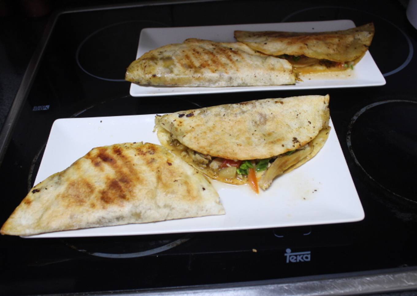 - Doblamos las tortitas y las colocamos en el grill doble durante 10 minutos para que se nos caliente el pollo.